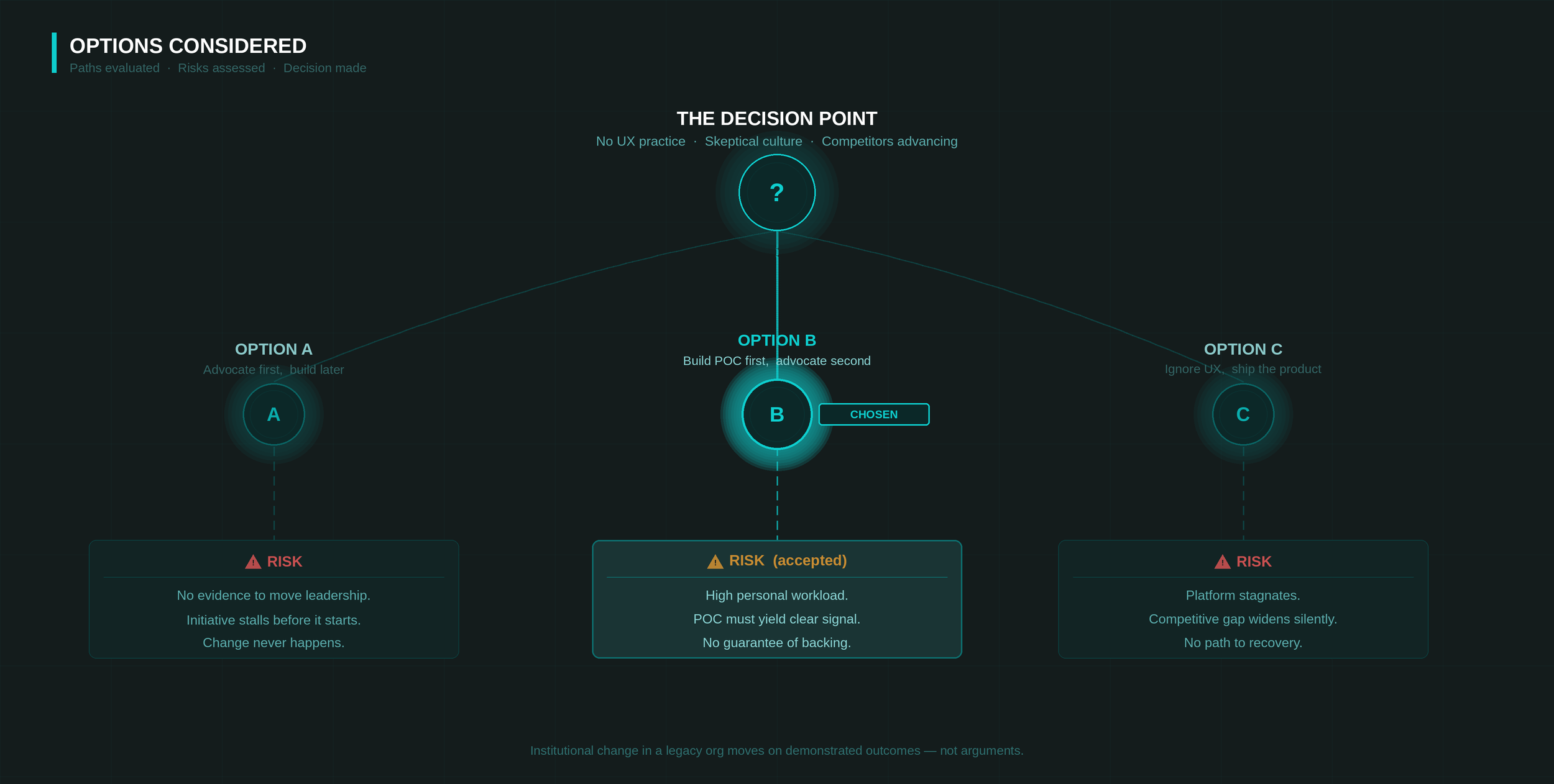 Option C was never a genuine consideration. The real decision was between A and B, and it came down to one question: what actually moves skeptical leadership in a legacy enterprise org?