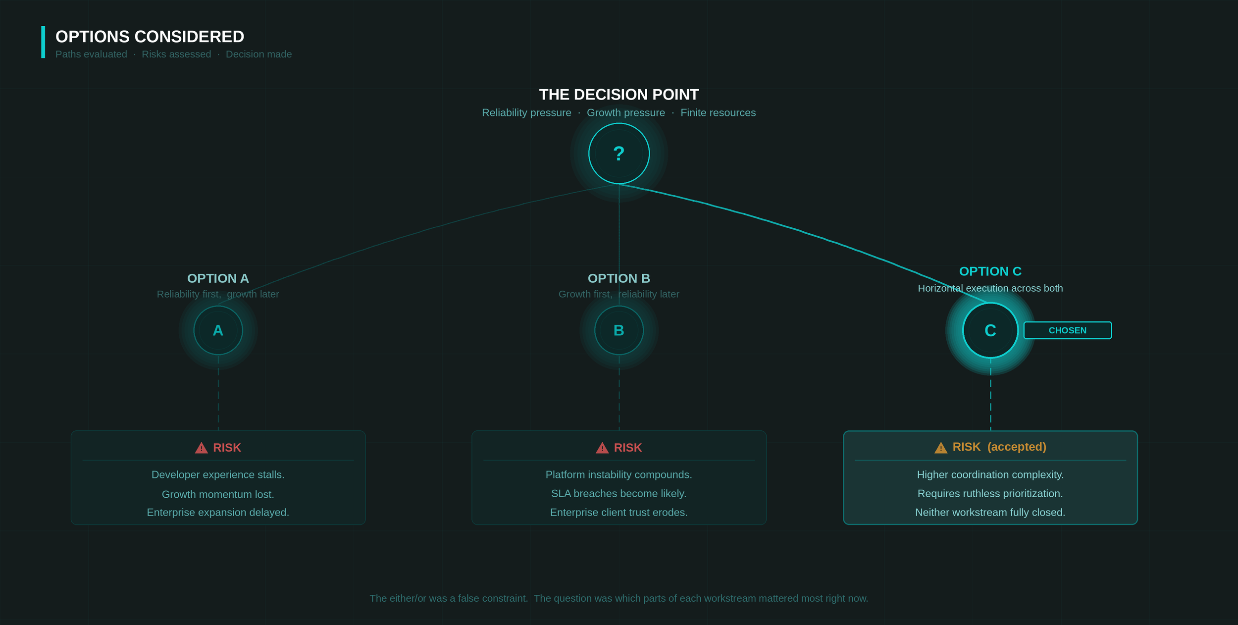 Options A and B both assumed a false binary, that the two workstreams couldn't coexist. In practice, not all reliability work was equally urgent, and not all growth work was equally impactful. The real question wasn't which workstream to choose, but which specific components of each were truly blocking versus which could wait.